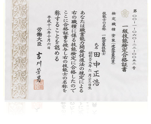 1級塗装技能士資格は、優秀な塗装技術がある証です